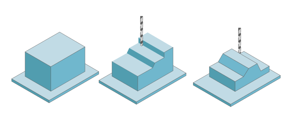 Pour rendre le processus de fraisage CNC aussi efficace que possible, le matériau initial à enlever est coupé par des outils plus grands à un taux de régime plus élevé. Cela permet le retrait rapide de la majeure partie du matériau. Lorsque la pièce est presque coupée à sa forme, des outils de plus haute précision avec moins de tours par minute entrent en jeu pour terminer la pièce.